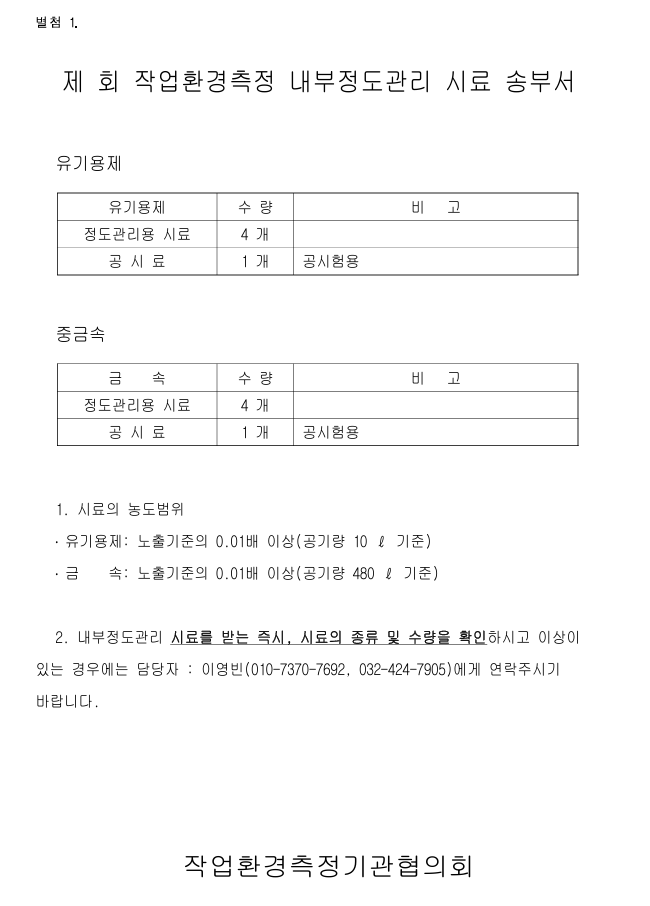 ① 내부정도관리용 시료와 시료송부서(별첨1)를 기관의 분석자에게 분배한다.