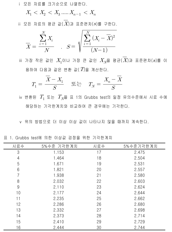 · 기준 값을 구하기 위해 통계적인 검정을 통해 이상 값을 제거하여야 한다. 이상값 제거는 Grubbs test를 이용하면 된다. 다음은 이상값 제거 과정이다.